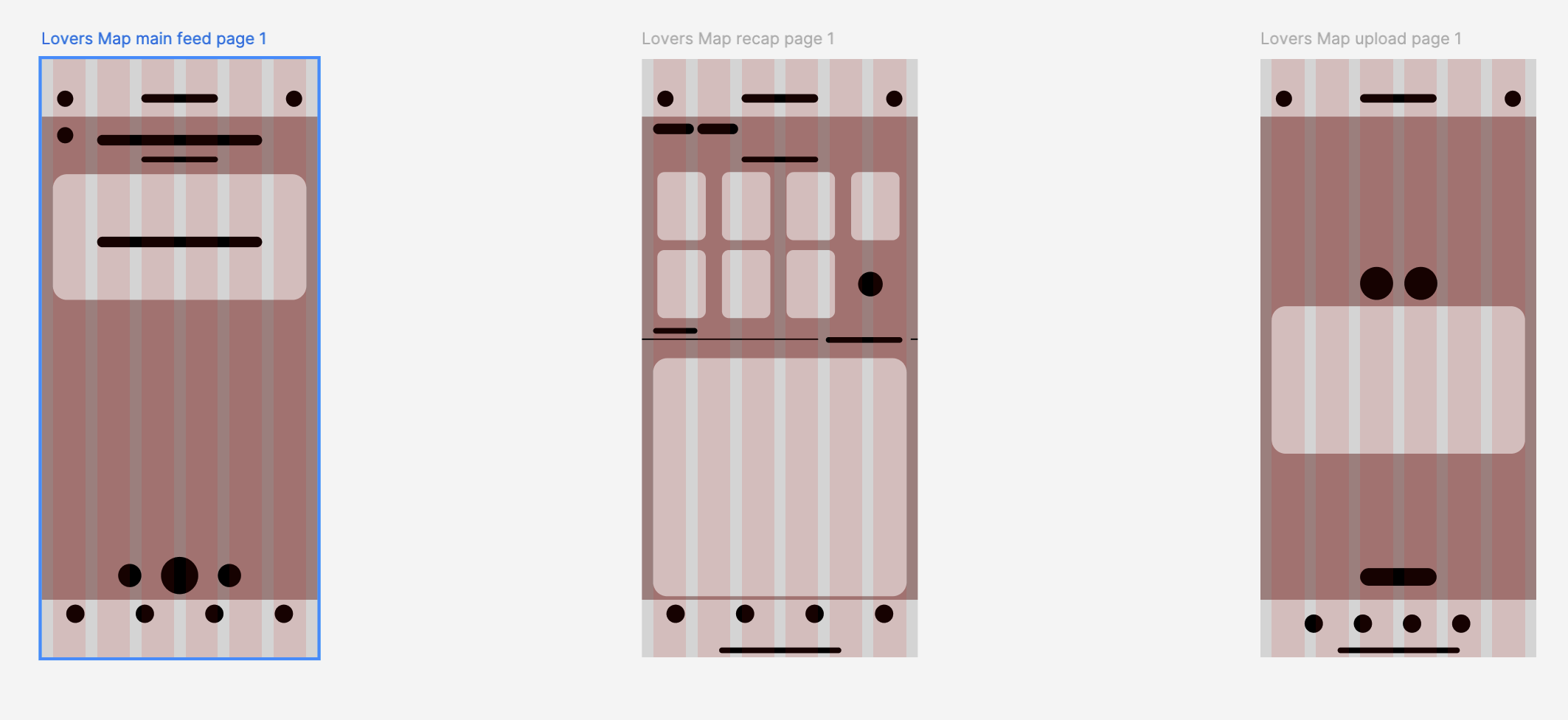 This sketch maps out the core flows of Lover Lane, focusing on exploration, interaction, and expression. It uses simple layouts to visualize how users move between browsing, connecting, and sharing.
